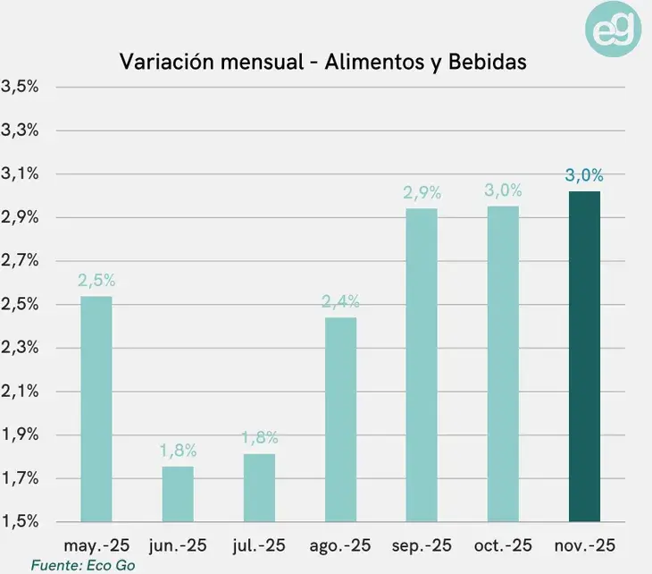 Si bien la carne vacuna se venía acelerando desde octubre, en noviembre profundizó su alza y marcó un incremento del 5,8%. “A esto se suma que el precio mayorista de la carne vacuna continúa registrando aumentos, por lo que no sería extraño observar nuevas subas en el corto plazo”, enfatizaron desde EcoGo.