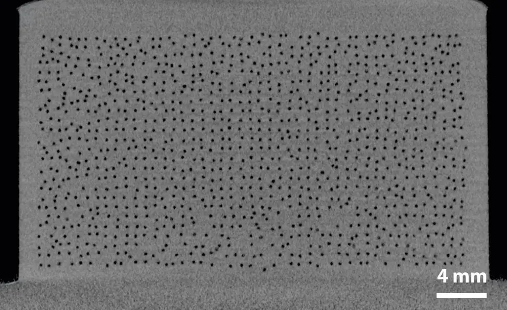 Imagen de microtomografía computarizada de la carne de pollo resultante. Los puntos negros indican la posición de las fibras huecas. (Nie et al., Tendencias en Biotecnología , 2025)