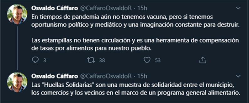“En tiempos de pandemia aún no tenemos vacuna, pero si tenemos oportunismo político y mediático y una imaginación constante para destruir. Las estampillas no tienen circulación y es una herramienta de compensación de tasas por alimentos para nuestro pueblo”, indicó el jefe comunal.