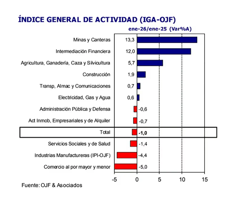 El Índice General de Actividad (IGA-OJF) presenta una variación interanual del -1.0% en enero de 2026, destacando el crecimiento de Minas y Canteras, y la contracción de Comercio y Manufacturas.