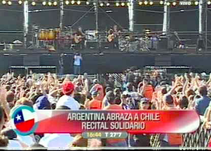 2010 – ARGENTINA / CHILE. Alrededor de 100.000 personas asisten en Buenos Aires al festival solidario “Argentina abraza a Chile”, en el que actuaron Ricardo Darín, Gustavo Santaolalla, Andrés Calamaro y Los Fabulosos Cadillacs. El festival reunió 60 toneladas de alimentos, ropa y medicinas para las víctimas del terremoto que sacudió a Chile el 27 de febrero de 2010.