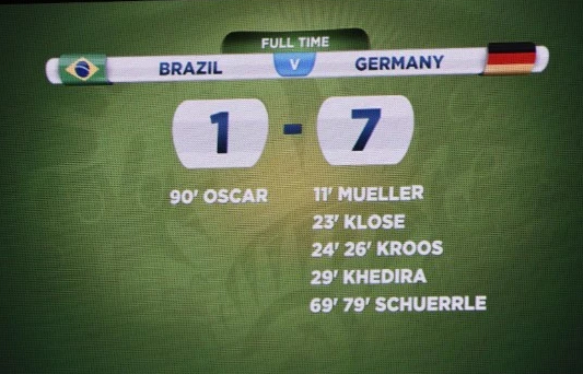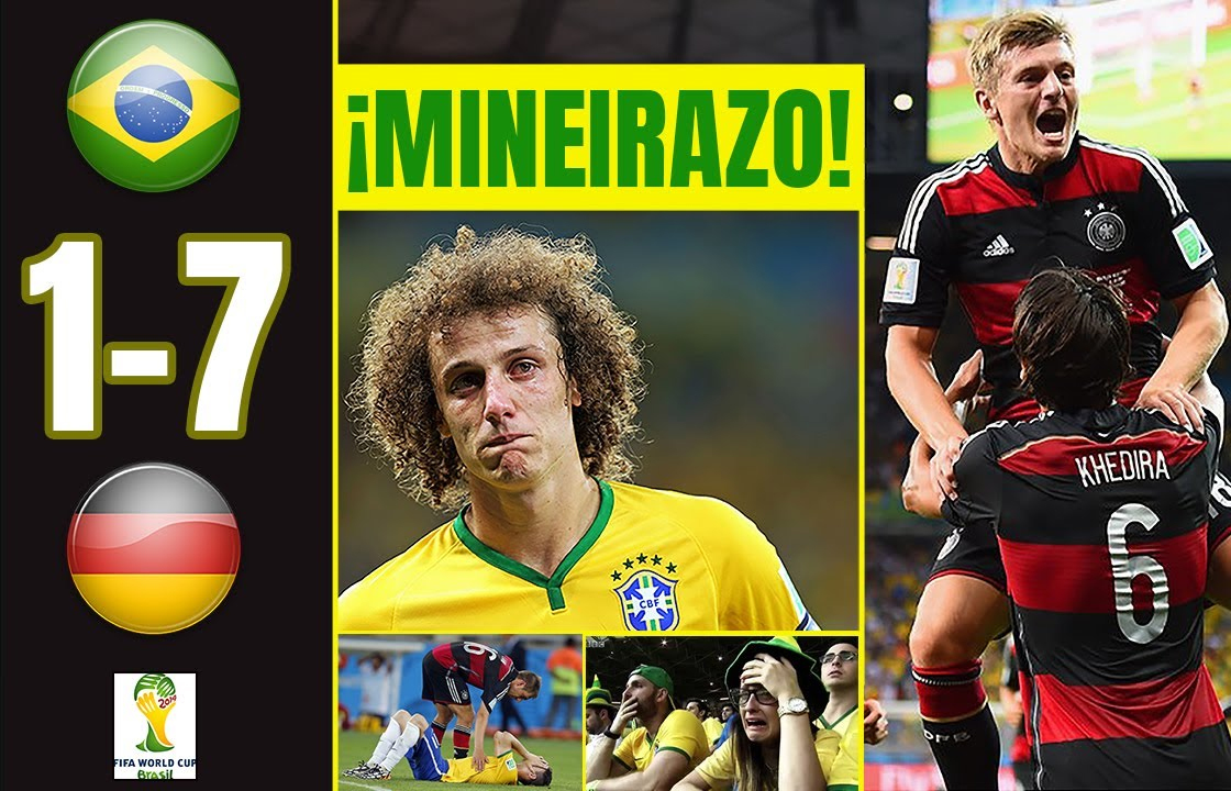 2014 – BRASIL 1 ALEMANIA 7. La selección de Alemania golea por 7-1 a Brasil en partido de semifinales del Mundial de 2014 disputado en el estadio Mineirao de la ciudad de Belo Horizonte. Fue la peor derrota de Brasil en su historia y cortó una racha de 39 años sin derrotas de los brasileños como locales en un torneo oficial.