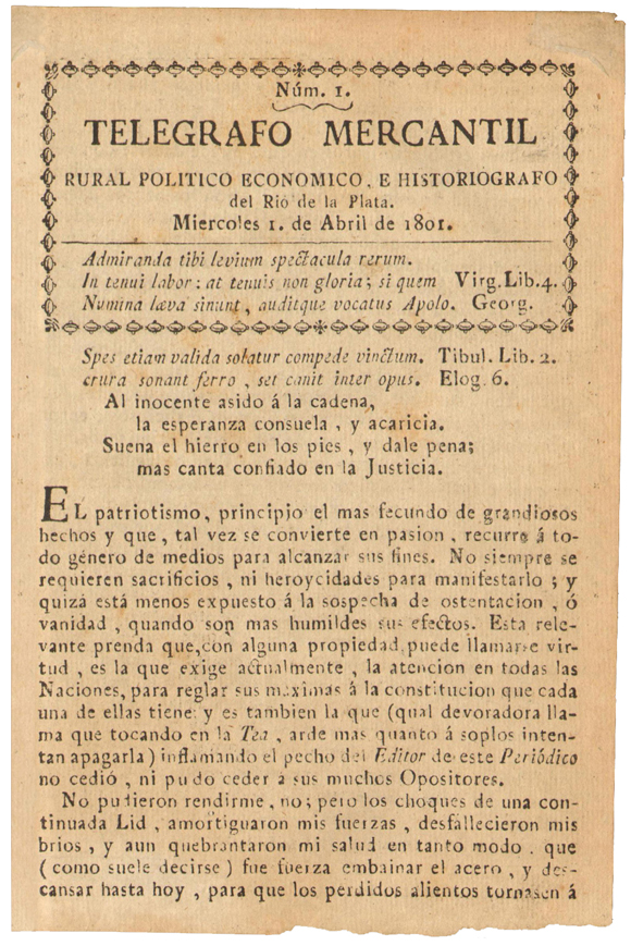 1801 – TELÉGRAFO MERCANTIL. Aparece en Buenos Aires el primer número del periódico Telégrafo Mercantil, fundado por Francisco Cabello y Mesa a instancias del abogado Manuel Belgrano, por entonces secretario del Consulado de Comercio del Virreinato del Río de La Plata.