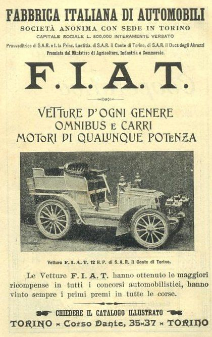 1899 – FIAT. Se funda en la ciudad de Turín la Fabbrica Italiana Automobili Torino, conocida por su sigla FIAT, una de las grandes multinacionales del automóvil. La primera fábrica del mayor grupo industrial italiano tenía  12.000 metros cuadrados y en ella trabajaban 150 obreros.