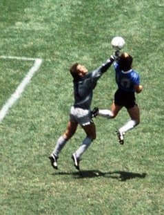 1986 – EL PARTIDO DEL 10. Con “La mano de Dios”, Diego Maradona marca el primer gol de la selección argentina ante Inglaterra, a la que eliminó del mundial de fútbol de México ‘86 al vencer por 2-1 con otro tanto del astro que pasó a la historia como “el gol del siglo”. El partido se jugó en el estadio Azteca de la Ciudad de México.