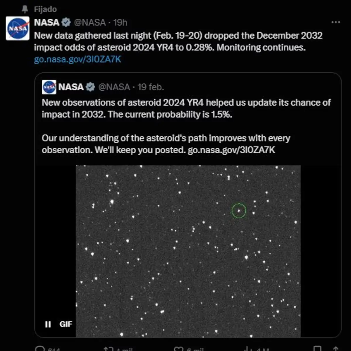 Sin embargo, nuevas observaciones realizadas la noche del 19 de febrero permitieron reducir la estimación al 1,5 %. Posteriormente, ayer 20 de febrero, la probabilidad descendió nuevamente al 0,28 %. Paralelamente, la ESA también realizó sus propias estimaciones. A lo largo del día, la agencia redujo la probabilidad de impacto desde un 1,4 % hasta un 0,16 %.