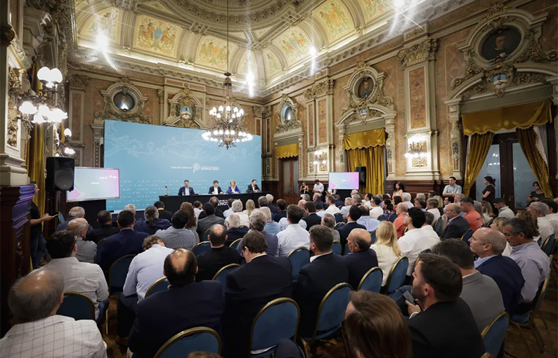 Kicillof, junto a Bianco, Magario y López, ante intendentes en el Salón Dorado de Gobernación.