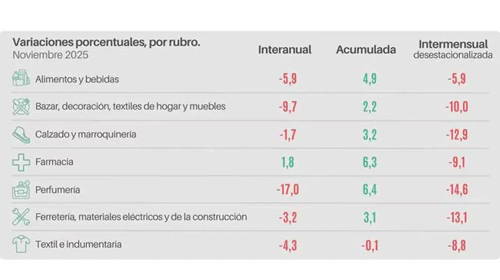 En el análisis sectorial, seis de los siete rubros relevados registraron descensos en las ventas interanuales, con las caídas más pronunciadas en Perfumería (-17%), Bazar y decoración (-9,7%) y Alimentos y bebidas (-5,9%). El único segmento que mostró crecimiento fue Farmacia, con un incremento del 1,8 por ciento.