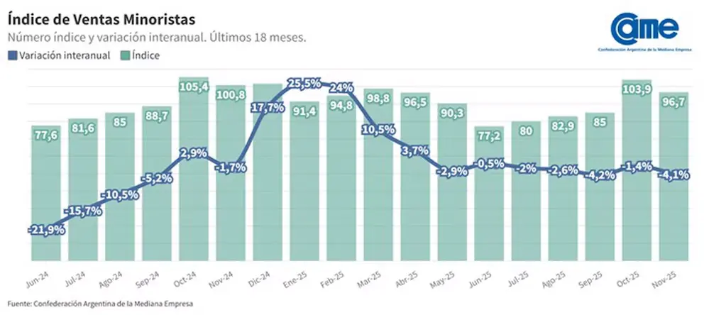 De acuerdo con la Confederación Argentina de la Mediana Empresa (CAME), en la comparación mensual desestacionalizada, la variación fue de -9,1%. Vale recordar que en octubre se había observado un repunte de 2,8% en relación a septiembre luego de 6 meses consecutivos de caída. De este modo, en lo que va del año, las ventas acumulan un incremento interanual del 3,4 por ciento.