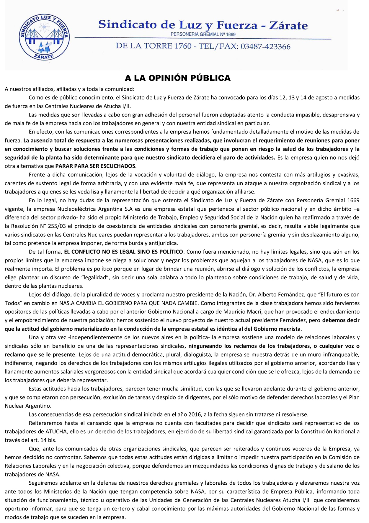 La semana pasada, el Sindicato de Luz y Fuerza de Zárate, realizó una medida de fuerza por tres días con paros de cuatro horas por turno que terminó en un comunicado de prensa que fue publicado y dado a conocer por la agrupación gremial. Estuvimos conversando sobre el contenido del mismo, con al Secretario Gremial, Cristian Riente. (NOTA CON AUDIOS)