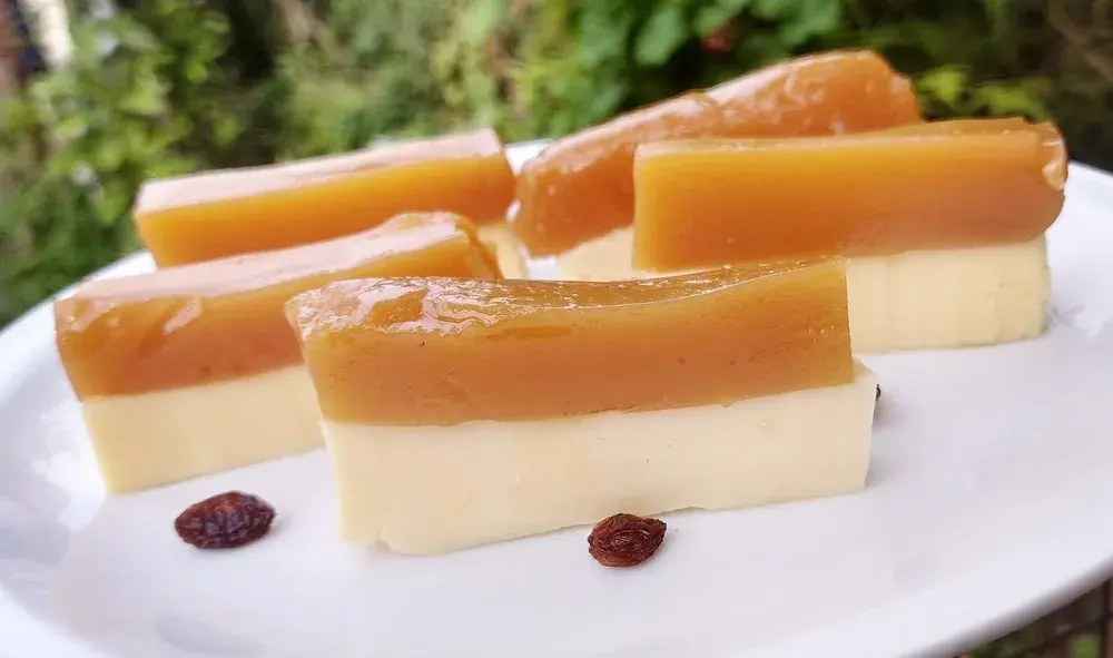 - Cortar una feta de queso y otra de dulce de 1/2 cm de espesor y que tengan el mismo tamaño.