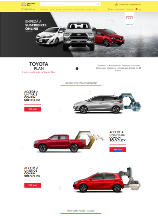 Toyota Plan fue reconocida por haber desarrollado en Mercado Libre la primera plataforma de e-commerce para planes de ahorro dentro de la región de América Latina. Esta plataforma permite una nueva forma de suscripción a los planes de ahorro de la empresa mejorando la experiencia del cliente y dándole la posibilidad de acceder a un plan sin necesidad de salir de su casa.