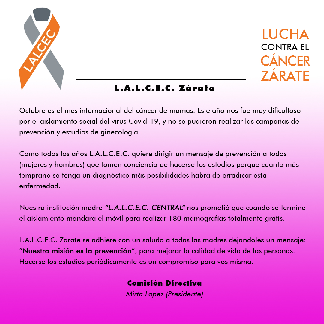Por último, “L.A.L.C.E.C. Zárate se adhiere con un saludo a todas las madres dejándoles un mensaje: “Nuestra misión es la prevención”, para mejorar la calidad de vida de las personas. Hacerse los estudios periódicamente es un compromiso para vos misma” termina el documento emitido hace pocas horas.