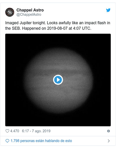 Ethan Chappel, de Texas, publicó en su cuenta de Twitter la grabación captada el pasado miércoles con el mensaje: “Imagen de Júpiter esta noche. Parece un terrible flash de impacto en el SEB (Cinturón Ecuatorial Sur). Sucedió el 07-08-2019 a las 4:07 UTC (Tiempo Universal Coordinado)”. “Hoy me ha parecido completamente irreal”, añadió Chappel en la red social.