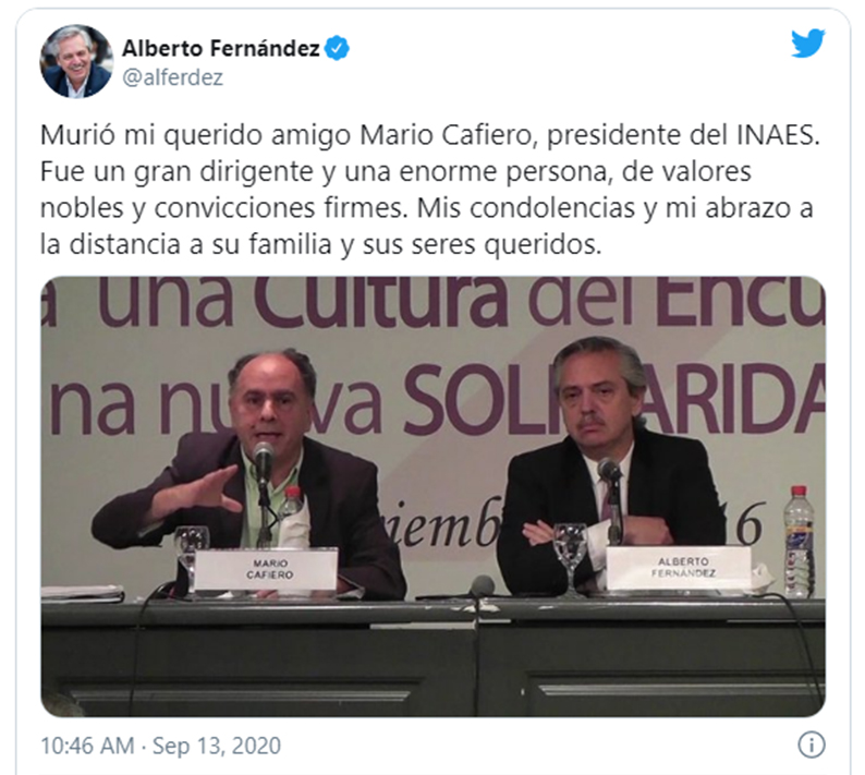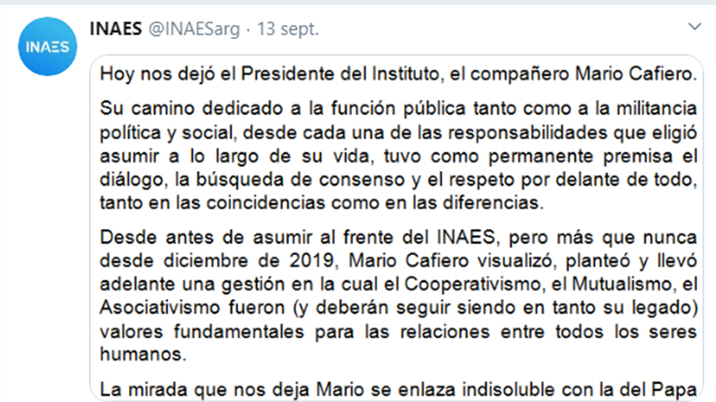 Mario Cafiero era vicepresidente del Movimiento Proyecto Sur y desde el inicio de la gestión del presidente Alberto Fernández asumió como titular del INAES, organismo dependiente del ministerio de Desarrollo Productivo”.