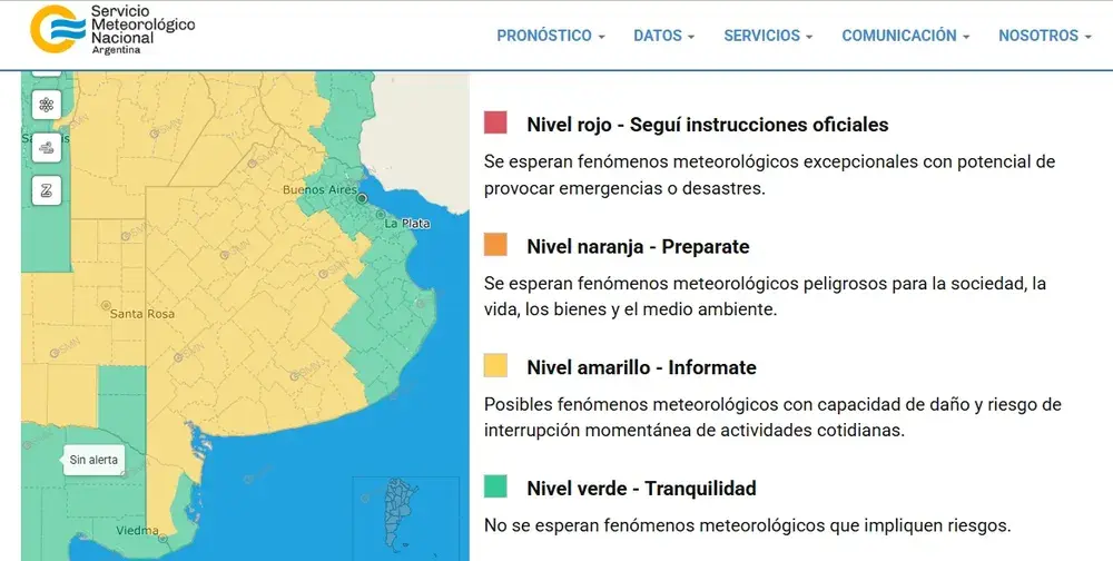 El SMN informó que el área alcanzada por la alerta “será afectada por lluvias y tormentas de variada intensidad, algunas localmente fuertes. Las mismas podrán estar acompañadas por abundante caída de agua en cortos períodos, frecuente actividad eléctrica, granizo e intensas ráfagas que pueden alcanzar los 90 km/h”.