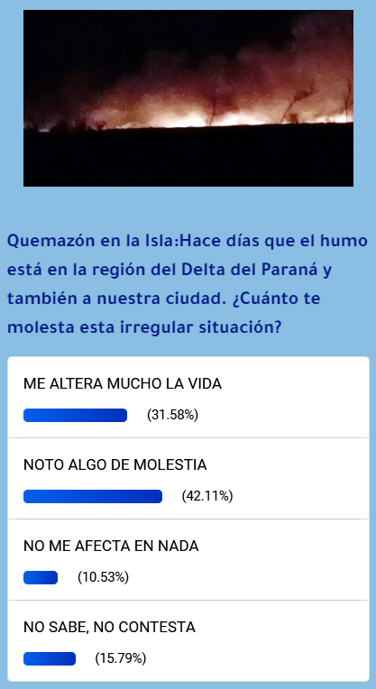 El resultado a la vista. Algo le molesta tuvo el 42,11% de los votos, mucho me molesta el 31,58% y nada me molesta, fue la elección para un 10,53% de los que opinaron en nuestro portal sobre una cuestión, irregularidad y/o delito que también durante la semana fue denunciada y controlada hasta por fuerzas federales, nota que publicamos donde Prefectura Naval detuvo a incendiarios en la isla.