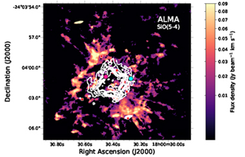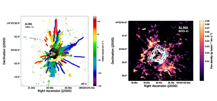 A partir de observaciones con el radiotelescopio ALMA, ubicado en el Desierto de Atacama, Chile, los investigadores distinguieron unos 38 filamentos de gas emanados desde ese centro, y notaron que la punta de los filamentos se desplazaba a mayor velocidad que la parte más cercana a la base, como si se tratara de decenas de proyectiles en distintas direcciones.