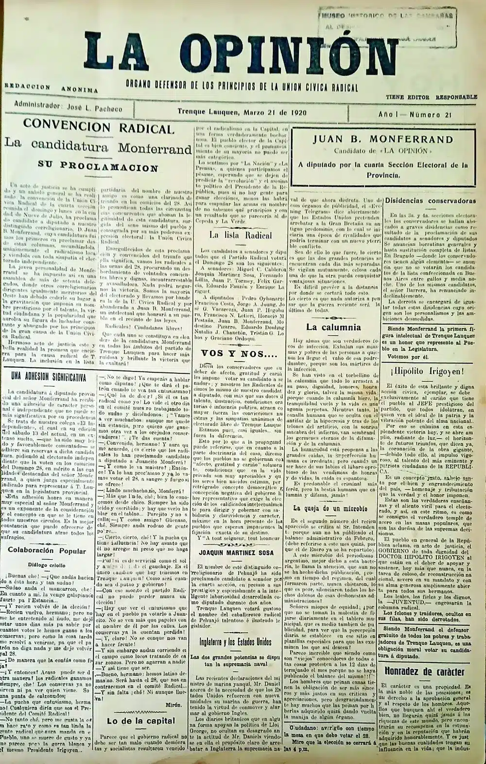 Hipólito Yrigoyen cumplía la mitad de su primera presidencia cuando La Opinión de Trenque Lauquen fue fundada por Manuel Gómez el 1º de noviembre de 1919. Era un mundo convulsionado, en crisis, y con una gran necesidad de informarse.