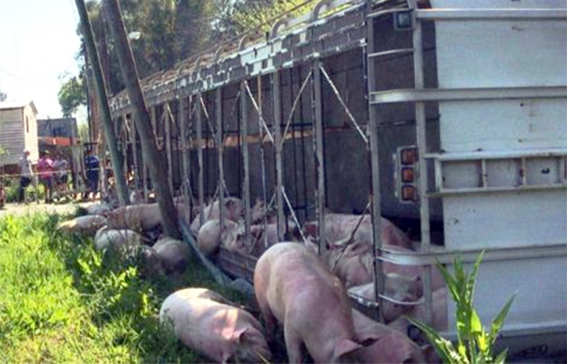 Un camión con una carga de 150 cerdos vivos volcó esta tarde en el Barrio Manantiales de la localidad de Pilar y decenas de vecinos de acercaron para atraparlos, carnearlos y llevarlos a sus casas.