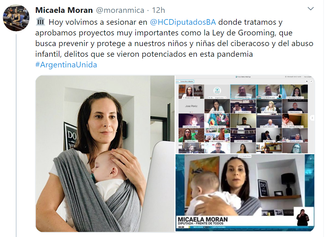 El hecho que se destaca, ocurrió en la última sesión de la Cámara bonaerenses, donde la diputada por Zárate Micaela Morán, quien al llegar a su turno de exposición se encontraba atendiendo a Milo, su hijo recién nacido. No todo lo que ocurre en las cámaras de las sesiones, es malo.