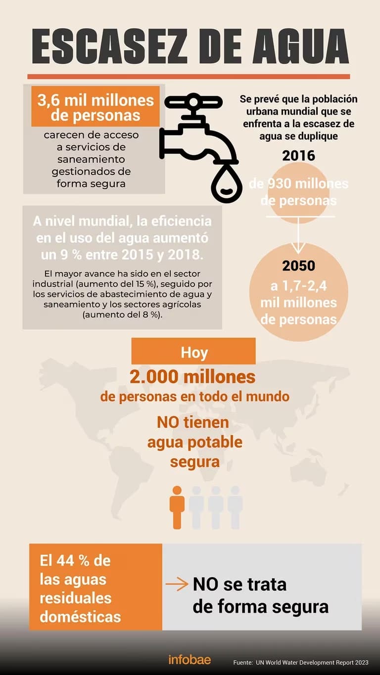 A nivel global, la demanda de agua se ha duplicado desde 1960, y el reporte prevé que esa presión aumente entre un 20% y un 25% más hasta 2050. El crecimiento de la población y la demanda de industrias como la agricultura, junto con políticas erráticas de uso del agua y la falta de inversión en infraestructuras son algunas de las causas de esta situación.