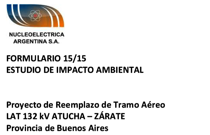 El Ministerio de Ambiente de la provincia de Buenos Aires informa que se encuentra abierta la instancia de participación pública para la obra “Reemplazo de Tramo Aéreo LAT 132 kV ATUCHA – ZÁRATE”. El trámite es el otorgamiento de Declaración de Impacto Ambiental.