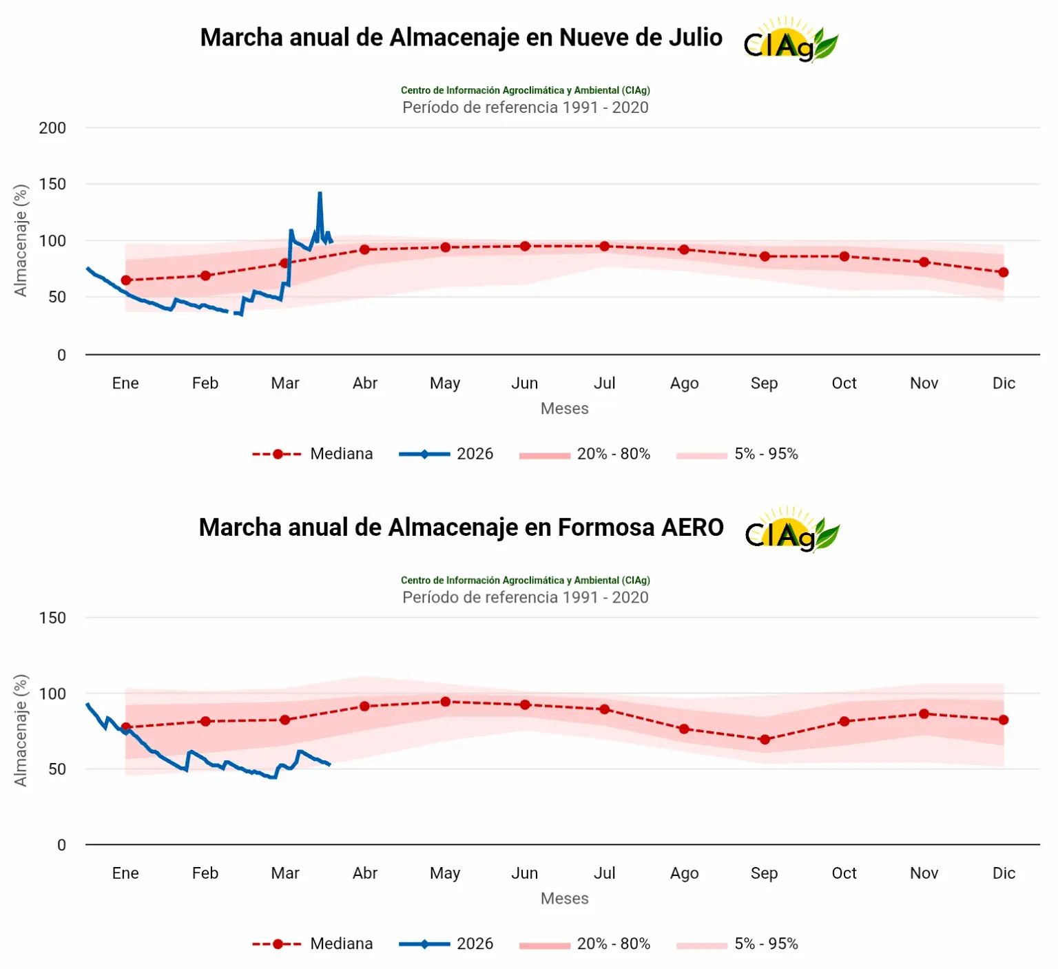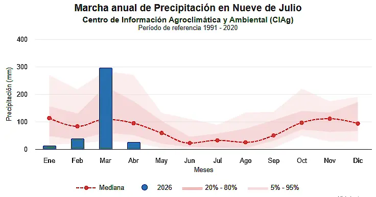 Y añadió: “Por ejemplo, se pueden mencionar las precipitaciones registradas en la localidad bonaerense de Nueve de Julio, que en marzo acumuló más de 290 mm. Este volumen supera el doble del valor medio de las lluvias mensuales del mes —139 mm—, según las estadísticas del período 1991-2020”.