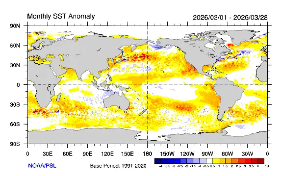 En este marco, Fernández Long resaltó que el Climate Prediction Center estimó que desde mediados de marzo, el Pacífico Ecuatorial está en transición desde condiciones Niña en debilitamiento hacia la neutralidad.