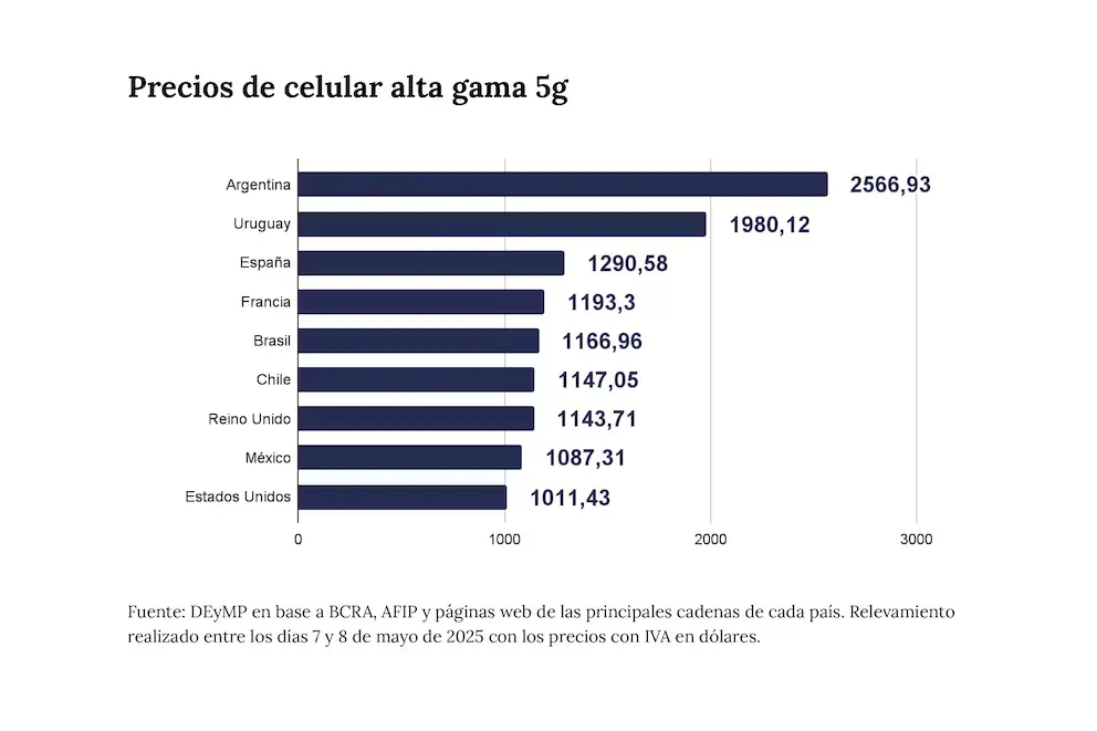 • Contexto de precios: hoy un celular de alta gama 5G cuesta en Argentina alrededor de 2.566 dólares, el doble de lo que cuesta en países como Estados Unidos (USD 1.011), Chile (USD 1.147) o España (USD 1.290). “Este nivel de precios genera múltiples problemas como menor acceso a una tecnología fundamental para el trabajo y la educación, aumento del contrabando y mayor incidencia delictiva en el robo de celulares”, dice el comunicado.