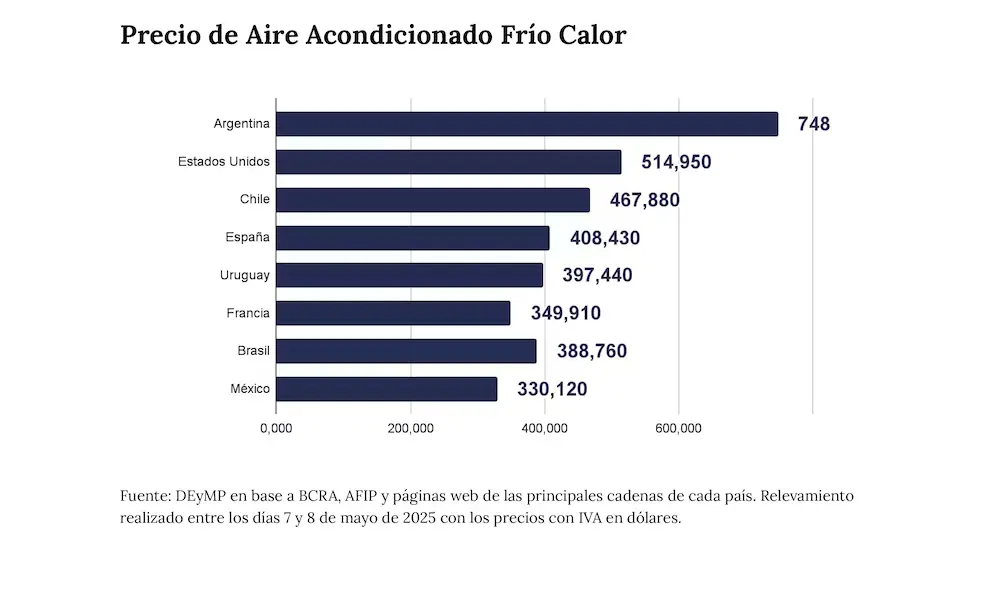 • Comparativa internacional: un aire acondicionado frío/calor cuesta hoy 748 dólares en Argentina, frente a 388 dólares en Brasil y 330 dólares en México, lo que marca una diferencia superior al 50%. La baja de impuestos busca acortar esta brecha.