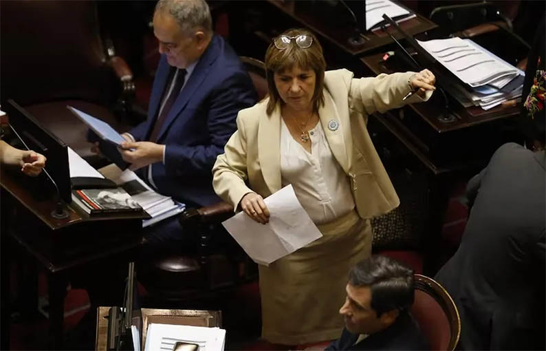 La senadora Patricia Bullrich, presidenta de la bancada de La Libertad Avanza, dio el discurso de cierre antes de que se votara la Ley de Reforma Laboral.