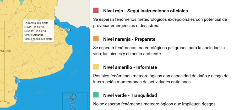 Frente a este panorama, el SMN emitió de manera preventiva una alerta de nivel amarillo. Así, se implica la posibilidad de fenómenos con capacidad de generar daños y riesgos de interrupción momentánea de actividades cotidianas.