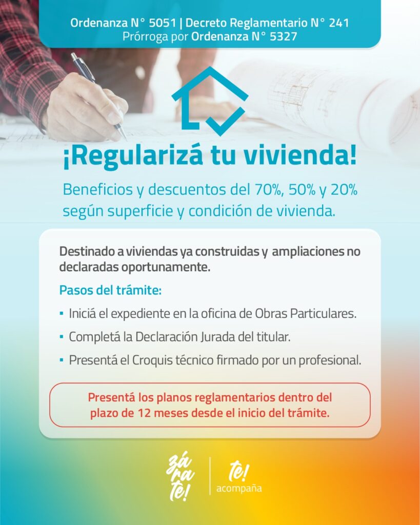 La Municipalidad de Zárate informa a la comunidad que continúan vigentes importantes beneficios para quienes deseen construir una vivienda nueva o regularizar edificaciones ya existentes.