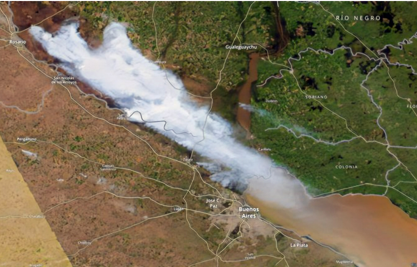 Zárate está en el medio de esta fotografía que muestra la densa humareda provocada por los incendios en el Delta del río Paraná no sólo se transformó en una triste postal casi cotidiana para Rosario y sorprendió a la zona del AMBA, sino que las columnas grises también pudieron ser divisadas desde el espacio. La imagen capturada por un satélite de la NASA da cuenta de la magnitud del humo originado por los reiterados focos ígneos, principalmente en territorio de la provincia de Entre Ríos.
